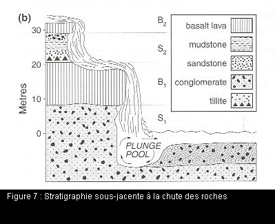 La chute de Gulfoss est constituée de deux paliers ayant au total une hauteur de 31 m. Ces paliers sont essentiellement dus à la stratigraphie sous-jacente à la chute (figure 7). La suite des couches lithologiques allant de la base de la chute jusqu’aux dernières du haut est la suivante :