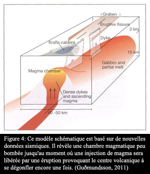 L'épisode volcano-tectonique de la Krafla Fires a commencé en décembre 1975 et a duré jusqu'en septembre 1984. Le premier signe d'un regain d'activité au sein du système volcanique de Krafla a été remarqué par l’augmentation de l'activité sismique en juin 1975. La première éruption s’est déclenchée le long d’une courte fissure dans la région de Leirnhjúkur, produisant une petite coulée de lave et quelques explosions (figure 2). L'éruption a été suivie par une subsidence immédiate dans caldeira, formant une dépression en forme de bol. Une inflation progressive du plancher de la caldeira s’en est suivi au cours des mois à suivant. Cette tendance graduelle d’inflation et de subsidence brutale s’est reproduite à plusieurs reprises dans les années suivantes. Ceci est connu comme un événement de divergence. Pendant la période du Krafla Fires, l’écartement des plaques s’est traduit par l’affaiblissement de la croûte dans la caldeira. Le magma s’est introduit dans ces faiblesses et les a remplis et, dans certains cas trouvé un chemin vers la surface pour produire une éruption.