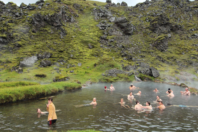 Laugahraun est composée de deux coulées ayant eu lieu en 1480 et qui proviennent d’une fissure longue de 2 km. Les laves de composition rhyolitique méta-alumineuse avec inclusion de basaltes tholéiitiques hybrides couvrent 1.57 km2. D’autre part, ce lieu possède des sources hydrothermales salines très populaires pour la baignade. De plus, de magnifiques montagnes rhyolitiques périalcalines sont visibles aux environs.