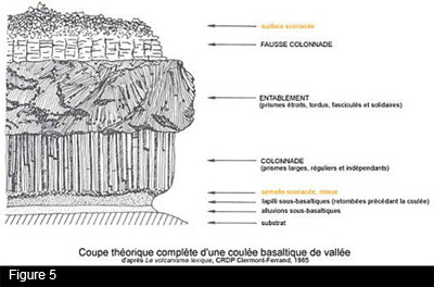 Ces formations, surprenantes par leur régularité géométrique, proviennent du refroidissement de coulées basaltiques subaériennes. Ce sont des prismes généralement hexagonaux, plutôt réguliers, qui sont disposés perpendiculairement à la surface de refroidissement de la lave. Une coulée suivra généralement plus ou moins bien un profil théorique en trois couches (figure 5). Une première couche au sommet, appelée fausse colonnade, montrera des structures en colonnes beaucoup moins bien organisées à cause du refroidissement plus rapide en surface. La seconde, située au cœur de la coulée et appelée l'entablement, présente une structure encore plus désorganisée, le refroidissement se propageant du haut et du bas. C'est la base de la coulée, la colonnade, observable à Svartifoss, qui montre les joints columnaires bien formés. Chacune de ces parties peut être d'importance variable ou même absente. Parfois, plusieurs couches de colonnades de différents diamètres sont observables au sein d'une même coulée. Ceci est dû à l’accommodation de la variation de vitesse de refroidissement selon la profondeur, et non à des coulées successives.